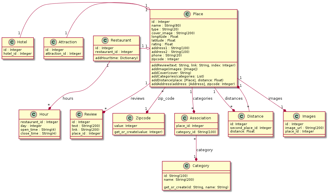 A place contains information that is needed to be displayed on the website for each instance of a model. Each place holds a relationship to several entries in the Images table(contains an image url), Distance table, Association table, Review table(contains a text preview of a Yelp review and a link to the full page), and an entry in the Zipcode table(assigns a unique ID to each zip code in the database).